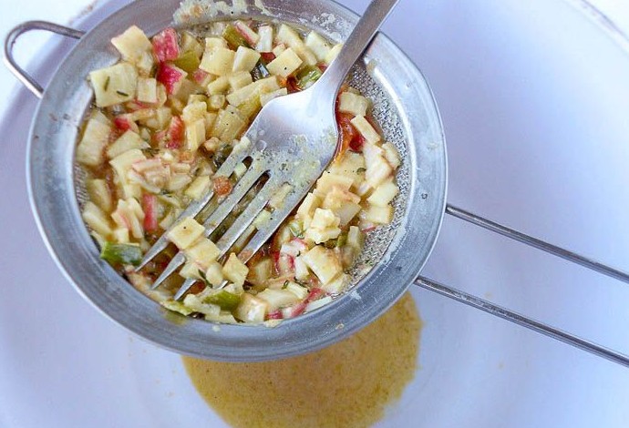 Массу из сковороды процедить через сито, энергично разминая ингредиенты ложкой. Собрать жидкость в отдельную емкость, жмых выбросить. Готовый соус процедить еще раз.