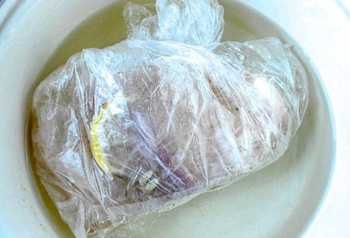 Взять целлофановый пакет, положить туда филе морского языка. Специи, соль смешать с маслом, влить в пакет с рыбой. Плотно завязать упаковку, равномерно распределив маринад по пакету.