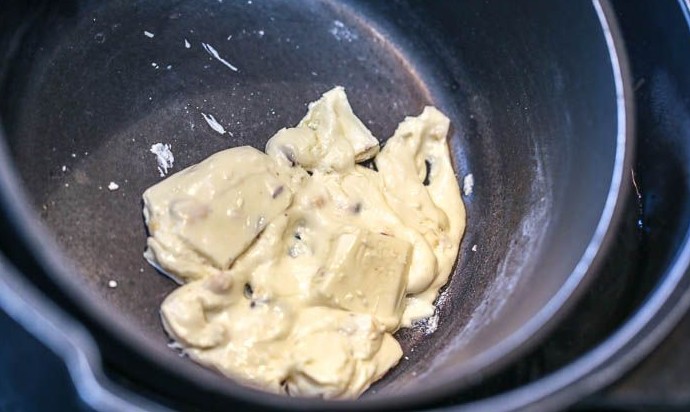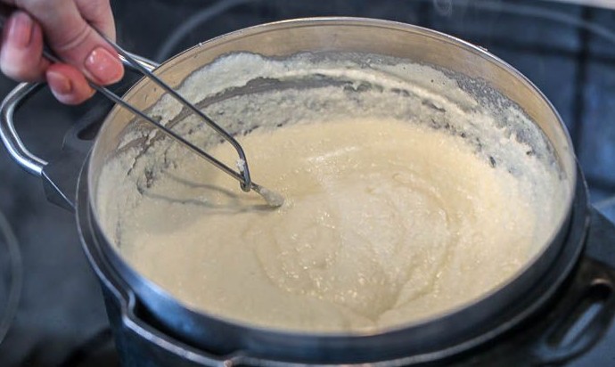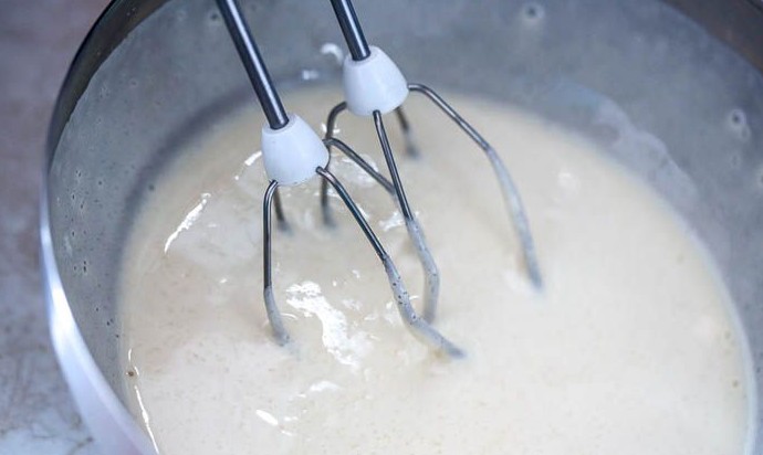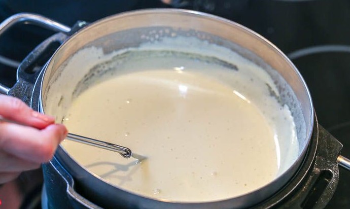 Поставить её на водяную баню и проварить, постоянно помешивая, пока слегка не загустеет и не станет похожа на крем.