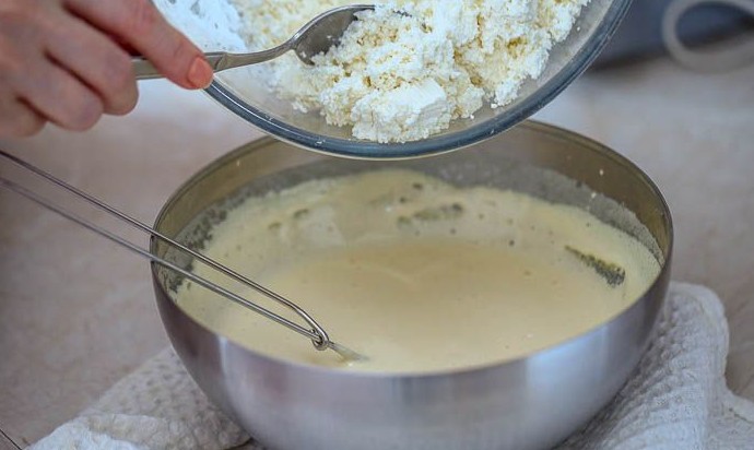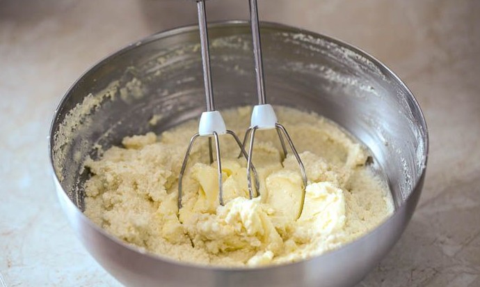 Добавить к этому крему протертый творог и вымесить миксером до однородности.