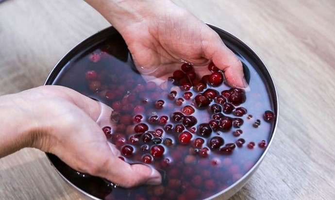 Свежую клюкву перебрать (удалить весь мусор, засохшие ягоды), переложить в миску с водой, хорошо промыть и откинуть на дуршлаг.