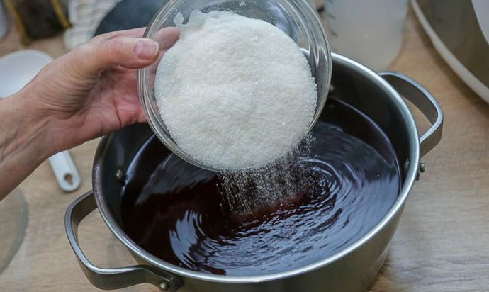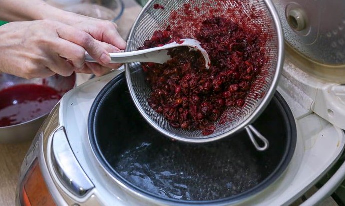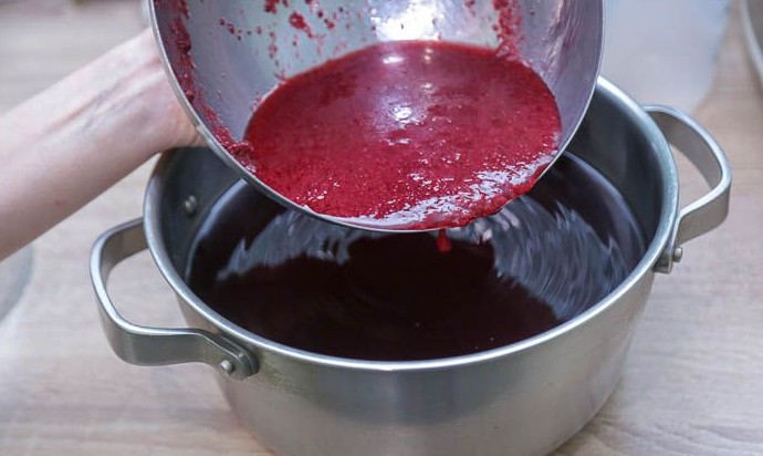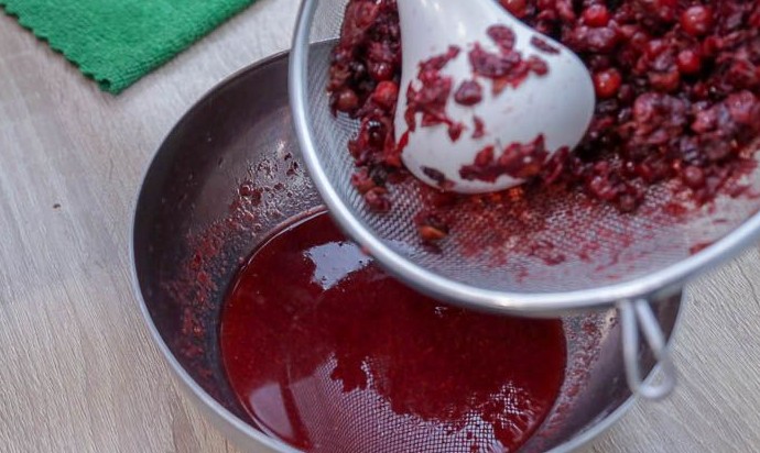 Спустя 3 часа процедить отвар из жмыха через сито в кастрюлю, туда же добавить протёртое клюквенное пюре,