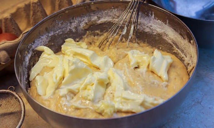 Теперь осталось примешать кусочки сливочного масла. Добавлять их по частям, равномерно подмешивая в тесто, пока оно перестанет липнуть к рукам и к стенкам миски. При вытягивании тесто уже не рвется, а хорошо тянется, образует полотно.