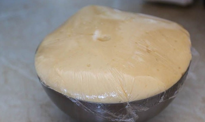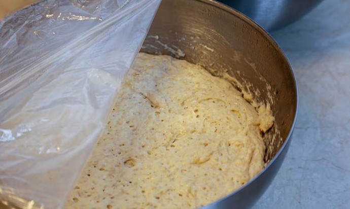 Накрыть миску с тесто пищевой пленкой, убрать в тёплое место, чтобы оно хорошо поднялось. Примерно через час обмять, и оставить для расстойки еще на 1.5 часа, пока оно не увеличится в объеме в 2 раза.