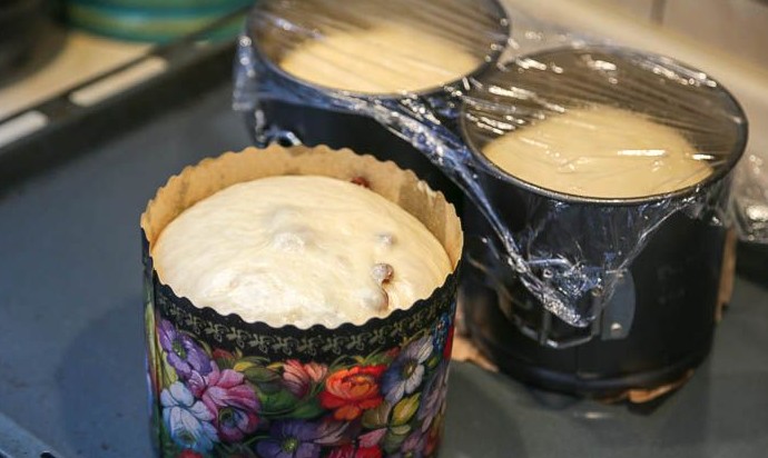 Готовое тесто разделить на порции, из каждой сформировать шарики и разложить их по формам, заполняя на 1/3 объема формы. Получилось 3 кулича по 300-350г.