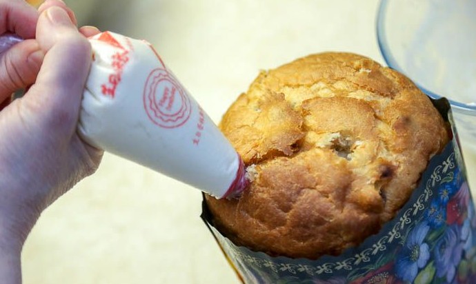 Охлажденный заварной крем переложить в корнетик с насадкой с длинным носиком. Отсадить крем через отверстия в куличе.