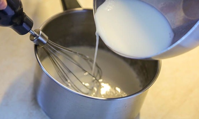 В другой миске развести крахмал небольшим количеством молока и перелить эту смесь в ковш с яйцами с сахаром. Остальное молоко довести до кипения, тонкой струйкой влить в яичную смесь горячее молоко, быстро размешивая венчиком, чтобы яйца не свернулись.