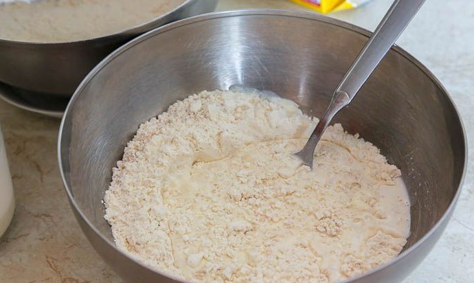 Примерно 100г просеянной муки смешать с дрожжами и 1 ч.л. сахара. Залить теплым молоком.