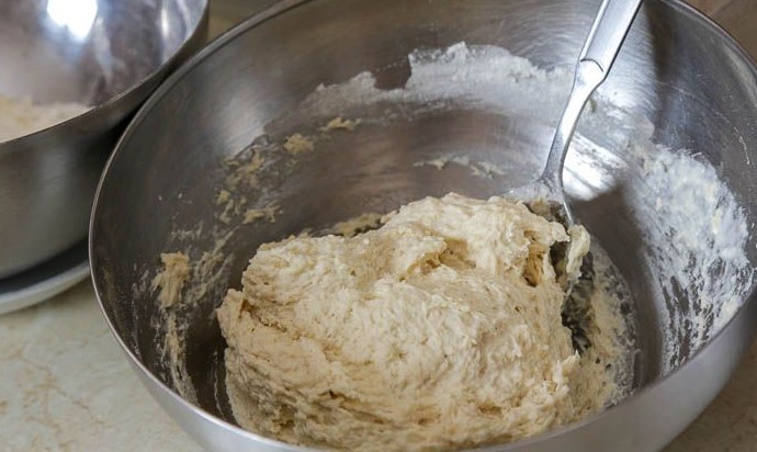 Постепенно подсыпать оставшуюся просеянную муку и тщательно вымешивать тесто.
