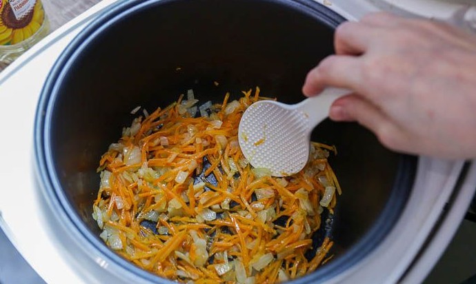 Выставить на экране мультиварки программу «Жарка». Когда чаша хорошо нагреется, налить примерно 50 мл растительного масла и переложить в неё лук с морковью. Обжаривать с открытой крышкой, помешивая лук с морковью лопаткой, пока овощи не начнут подрумяниваться.