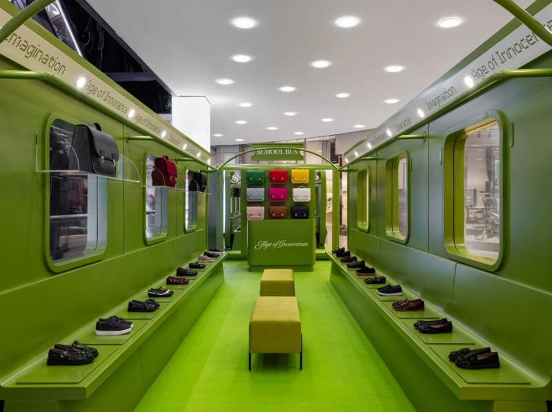 Креативный корнер Age of Innocence в формате школьного автобуса сложно не заметить! Автобус Age of Innocence насыщенного травяного оттенка припаркован прямо в центральном атриуме на 1 этаже.