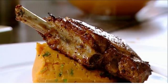 Ингредиенты: 4 свиных корейки с костью, около 250 -300 г ---------------------- 1/2 до 1 чайная ложка порошка чили ---------------------- 1 чайная ложка сладкой паприки ---------------------- Морская соль и черный перец ---------------------- 2 столовые ложки оливкового масла ---------------------- Несколько веточек тимьяна ---------------------- 4 зубчика чеснока ---------------------- От 5 до 6 звезд аниса ---------------------- 1 чайная ложка семян кориандра ---------------------- 3 больших сладкий картофеля ---------------------- 1 красный Чили ---------------------- Пучок кинзы Приготовление: Замаринуйте свинину в смеси порошка чили, паприки, семян кориандра, звездочками аниса, тимьяном, чесноком, оливковым маслом, солью и перцем В сковороду налейте оливковое масло, обжарьте свиные отбивные (придать отбивным цвет со всех сторон и поставить в духовку на 8-10 минут при 200 градусах) Вскипятить куриный бульон, отварить сладкий картофель и процедить. В горячую сковороду налить оливковое масло, положить лук шалот, чеснок, приправить солью и перцем Добавить сладкий картофель и растолочь Добавить свежий кориандр и листья шалфея. В сервировочную тарелку положить сладкий картофель, сверху свинину. Можно при желании украсить рукколой. Приятного Вам аппетита!