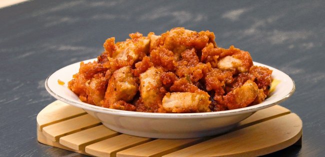 Возьмите 300 г свинины (ту её часть, которую вы предпочитаете жарить) и нарежьте такими кусками, какими вы предпочитаете жарить свинину. Посолите мясо и поперчите.