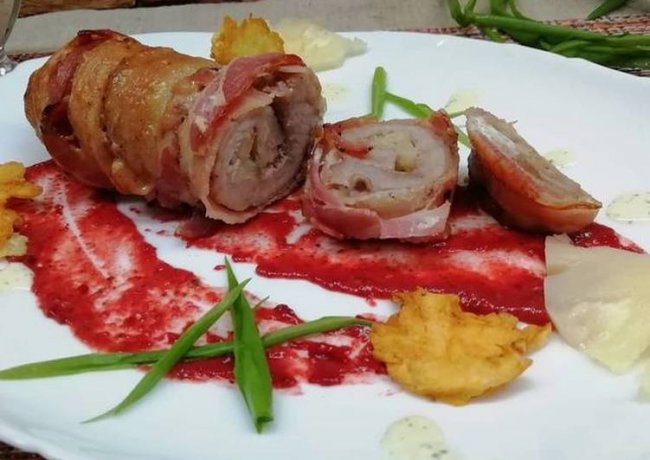 Ингредиенты: 300-400 гр свиной вырезки ---------------------- 70-100 гр твердого сыра (в том числе и на чипсы) ---------------------- 70-100 гр ананасов (можно консервированных) или заменить яблоком Для соуса: соль ---------------------- перец ---------------------- сметана ---------------------- горчица ---------------------- чеснок Для Клюквенно-облепихового соуса: горсть ягод клюквы ---------------------- горсть ягод облепихи ---------------------- вода ---------------------- гвоздика ---------------------- соль ---------------------- сахар ---------------------- перец ---------------------- чеснок Сметанно-чесночный соус: сметана ---------------------- чеснок ---------------------- любая зелень ---------------------- соль ---------------------- перец Приготовление: Мякоть свинины отбить и хорошо (с внутренней стороны) натереть солью, перцем, смесью из сметаны горчицы чеснока). Выложить на мясо тёртый сыр и мелко порезанный ананасы (можно консервированные) и туго свернуть рулет. Хорошо обвязать ниткой. Обжарить на раскаленной сковороде, с небольшим количеством масла до румяной корочки. Затем аккуратно снять нитку и обернуть рулет беконом, выложить на противень с пергаментом и запечь до готовности, время от времени поливать выделившимся жиром. Клюквенно-облепиховый соус. В сотейник выложить ягоды клюквы и облепихи, добавить совсем немного воды, соль, перец, сахар, гвоздику, выдавить дольку чеснока и уварить до густоты. Затем протереть соус через сито. Подать соус к мясу. Сметанно-чесночный соус. В сметану выдавить чеснок по вкусу, добавить соль, перец, зелень. Сырные чипсы. Сыр натереть на терке и жарить на раскаленной сковороде, как оладьи до зарумянивания, по несколько секунд. Приятного Вам аппетита!