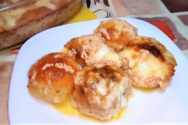 Ингредиенты: картофель 600 г ---------------------- мясной фарш 500 г ---------------------- сметана 400 г ---------------------- сыр моцарелла 200 г ---------------------- сыр плавленый 1 шт. ---------------------- морковь 1 шт. ---------------------- яйца 1 шт. ---------------------- лук 1 шт. ---------------------- томатная паста 1 ст.л. ---------------------- приправы ---------------------- соль Приготовление: Шаг 1. В фарш добавляем обжаренные лук с морковью, тертый на мелкой терке сырок, яйцо, соль, перец. В 100 мл воды растворяем томатную пасту и соединяем со сметаной, добавляем специи и соль по вкусу. Шаг 2. В блюдо кладем очищенный картофель, в центр кладем сформированные котлеты, заливаем подливой и отправляем в разогретую духовку на 1 час. Затем посыпаем тертым сыром и отправляем в духовку на 3 минуты. Приятного Вам аппетита!