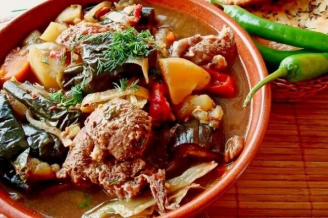 Ингредиенты: баранина жирная 400 г ---------------------- перец болгарский красный 2 шт. ---------------------- баклажаны 2 шт. ---------------------- помидоры 2 шт. ---------------------- морковь 2 шт. ---------------------- лук репчатый 2 головки ---------------------- чеснок 4 зубчика ---------------------- перец черный молотый ---------------------- зелень ---------------------- соль Приготовление: ШАГ 1 С баранины срезать жир. Положить обрезки в казан с толстыми стенами. Порезать мясо на большие куски, положить на жир, посыпать перцем, солью. Почистить баклажан, порезать на кубики, посыпать солью, отставить минут на десять, отжать. ШАГ 2 Нашинковать крупно болгарский перец, луковицу, морковь. Порезать на полукруглые кусочки помидоры. Уложить на мясо слоями овощи: лук, сверху морковь, баклажаны, сладкий перец, помидоры. Чуть-чуть посыпать перцем, солью, измельченной зеленью, чесноком. Накрыть казанок крышкой. ШАГ 3 Тушить овощное рагу с жирной бараниной на маленьком огне часа два, не размешивая. Добавлять воду нет необходимости, овощи пустят сок сами. Приятного Вам аппетита!