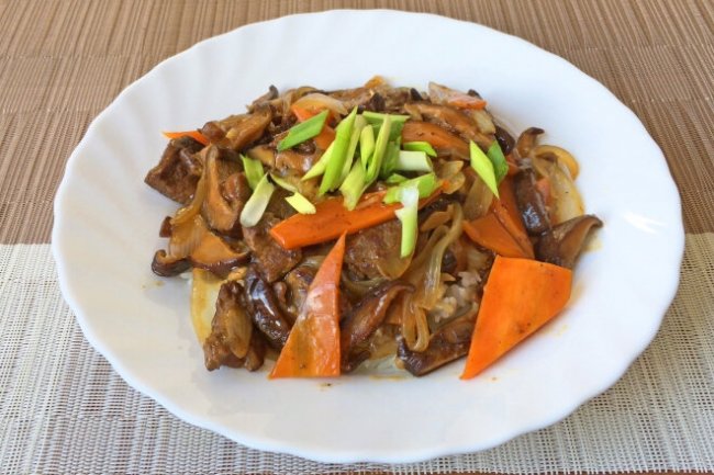 Ингредиенты: говядина 140 г ---------------------- грибы шиитаке сушеные 30 г ---------------------- морковь 1 шт. ---------------------- лук ? шт. ---------------------- чеснок 1 зубчик ---------------------- бульон куриный 230 мл ---------------------- кукурузный крахмал 1 ст.л. ---------------------- масло кунжутное 1 ст.л. ---------------------- соус соевый 1 ст.л. ---------------------- соль по вкусу Приготовление: ШАГ 1 Шиитаке замочить в теплой воде на 1 час до мягкости. ШАГ 2 Говядину тонко нарезать. Морковь тонко нарезать. Лук нарезать полукольцами. Чеснок раздавить ножом и мелко нарубить. ШАГ 3 Куриный бульон смешать с кукурузным крахмалом. ШАГ 4 В сковороду влить кунжутное масло. Выложить говядину на сковороду и жарить на сильном огне 2 минуты. ШАГ 5 Добавить чеснок, жарить 1 минуту. ШАГ 6 Добавить грибы готовить 2 минуты. ШАГ 7 Добавить лук и морковь, жарить 2 минуты. ШАГ 8 Влить соевый соус, перемешать. Добавить соль и перец. Влить куриный бульон, смешанный с кукурузным крахмалом, помешать немного. Убавить огонь до слабого и готовить еще 5-7 минут. Приятного Вам аппетита!