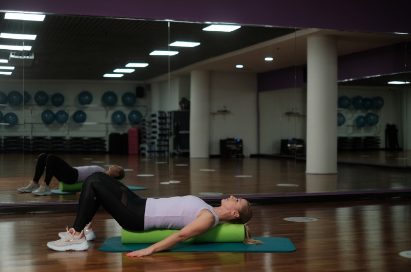 Для начала сделаем упражнение для снятия напряжения спины. Ложимся на ролл грудным отделом, размещая на нем область лопаток. Руками поддерживаем голову, чтобы не напрягать шею. Локти направляем вверх в потолок. Поднимаем таз так, чтобы центр тяжести сместился на грудной отдел спины. В этом положении прокатываем роллом середину спины до нижних ребер, не касаясь их. Делаем 12 повторений. Затем раскрываем локти в стороны и прокатываем еще 12 повторений.