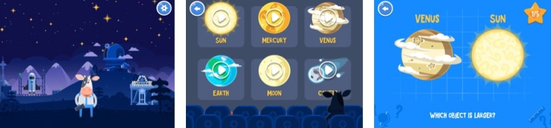 Приложение для юных исследователей космоса. Проводником ваших малышей будет мультипликационная корова, которая объяснит, как функционирует Солнечная Система и Вселенная, и расскажет о каждой планете и известных созвездиях по порядку. Приложение создано в формате игры, чтобы сохранить азарт в изучении космических явлений. Начинать исследования разработчики предлагают с 4 лет.