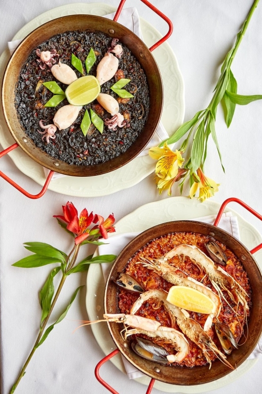 Mercado del Sol – это, конечно, про солнце Испании, паэлью с морепродуктами, тапасы, хамон, сыр манчего и большие лепешки с лангустинами и цукини или с чоризо и ромеско. За атрибуты рынка здесь отвечают витрина с разнообразной рыбой и аквариумы с устрицами и морскими ежами, а за настроение и атмосферу – отличная подборка современных художников на стенах.