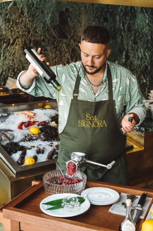 Эффектный рыбный ресторан Антонио Фреза с аквариумом-колонной до потолка, как в океанариуме, расположился на Большой Морской (вот и не верь потом в совпадения) в историческом здании 1737 года постройки. Sea, Signora – это один из самых масштабных рыбных ресторанов (около 1000 кв. метров), да еще и с собственной лавкой. Поставщики, фермеры – только лучшие и со всего мира, что уж говорить про raw-бар на десятки позиций, аквариумы и ледники. На столах – итальянская майолика Rafaellesco с драконом из города Дерута, известная с XIII века, а столовые приборы от бельгийцев Serax словно нарочно отделаны по-разному, как будто гость пришел со своей вилкой, как делали в Европе XVI века. Даже жилеты официантов и барменов – явный отсыл к сицилийским (где жил Антонио) панчотто, а принт на рубашках – тюльпан в вазе – узор из графики фирменного стиля.