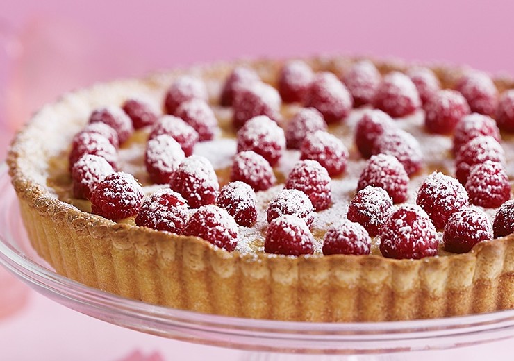 Наполните остывшим кремом нашу кростату и украсьте, чем хотите (я использую свежую малину). Оставьте кростату в холодильнике до полного остывания.