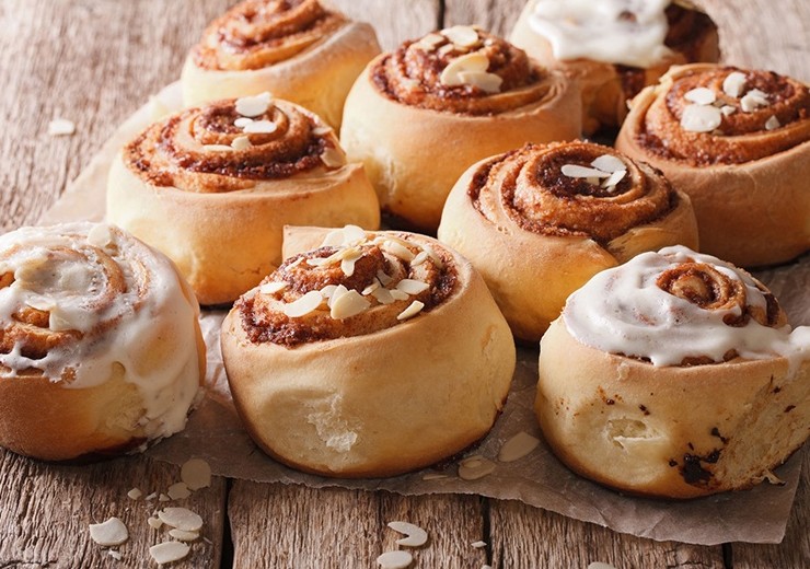 Раскатайте тесто на силиконовом коврике обычной или силиконовой скалкой, обернутой в пищевую пленку. Сверху равномерно посыпьте корицей и подсластителем, аккуратно сверните в рулет, нарежьте на булочки по 4 см шириной. Дайте им 5 минут постоять, а затем выпекайте при температуре 180°С 30 минут.