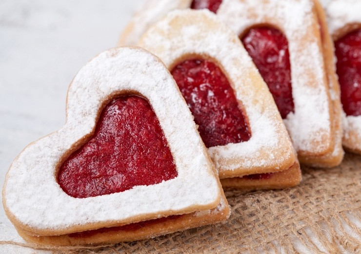 Слепите печенье формочками (основа – большая формочка, а сердцевина – маленькая). Наложите на основу тесто с вырезанной сердцевиной. Выпекаем 30-40 минут при 120°C.