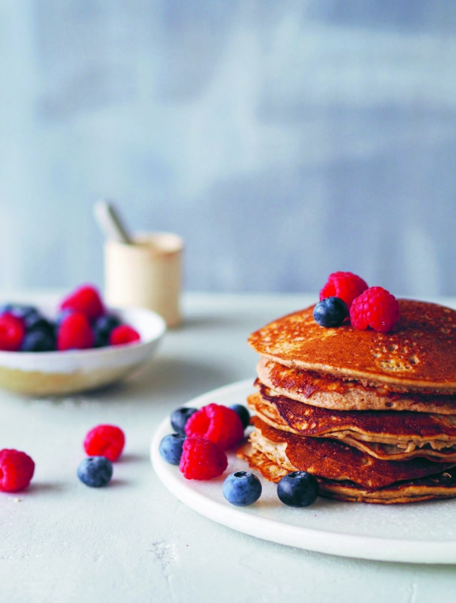 Ручным блендером хорошенько перемешайте все ингредиенты (кроме яблока), потом добавьте тертое яблоко. Нагрейте большую сковороду для жарки на малом или среднем огне, растопите масло и вылейте треть теста для блинов. Готовьте до появления пузырьков (около 2 минут), потом аккуратно переверните — и еще одну-две минуты с обратной стороны. Так же поступите и с остальным тестом. Лучше всего выпекать эти блины медленно и дольше, чем мучные. Подавайте с йогуртом и сезонными свежими ягодами.
