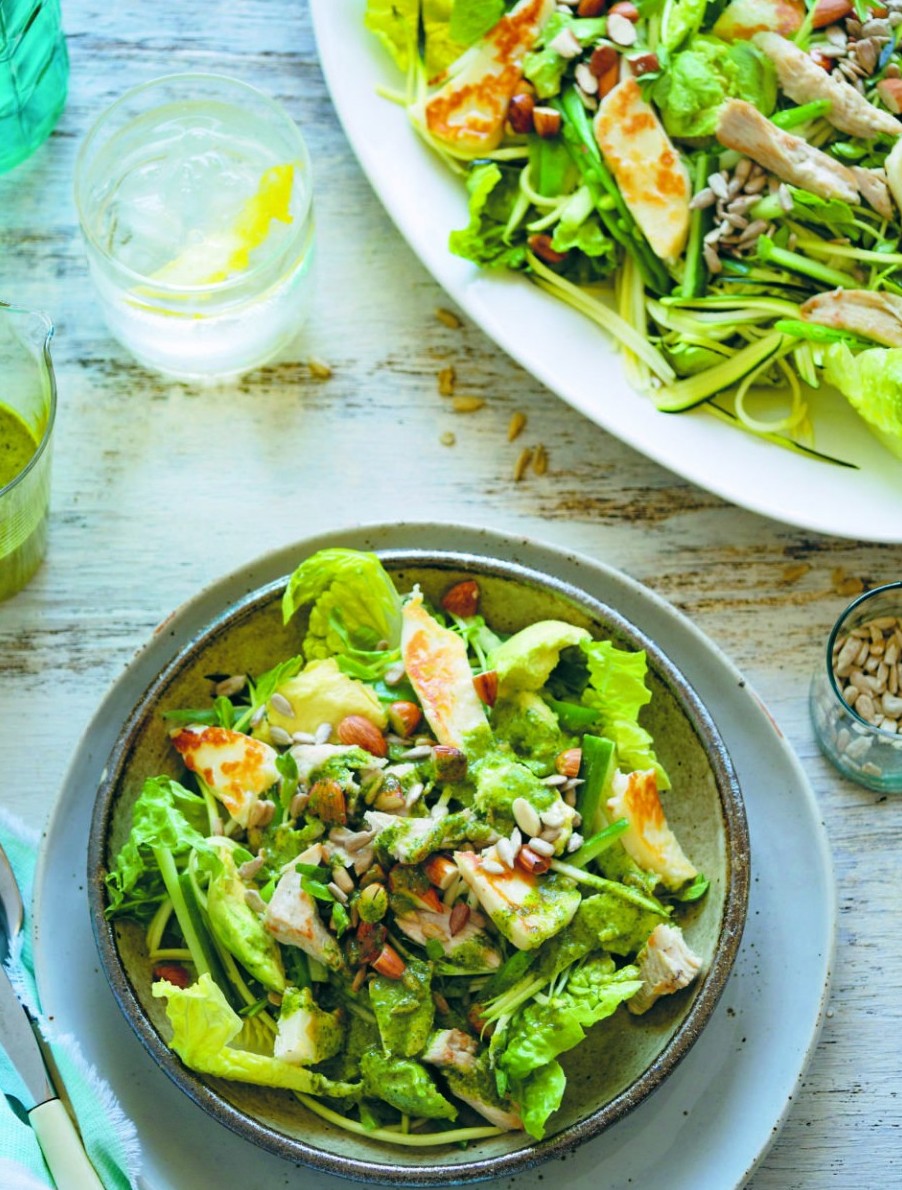 В большой сервировочной посуде смешайте нарезанные листья салата с цукини, огурцом, горошком, пророщенным горошком и авокадо. Добавьте охлажденный сыр халуми и курицу, сверху посыпьте семечками подсолнуха и миндалем. Посолите и поперчите, полейте оливковым маслом.
