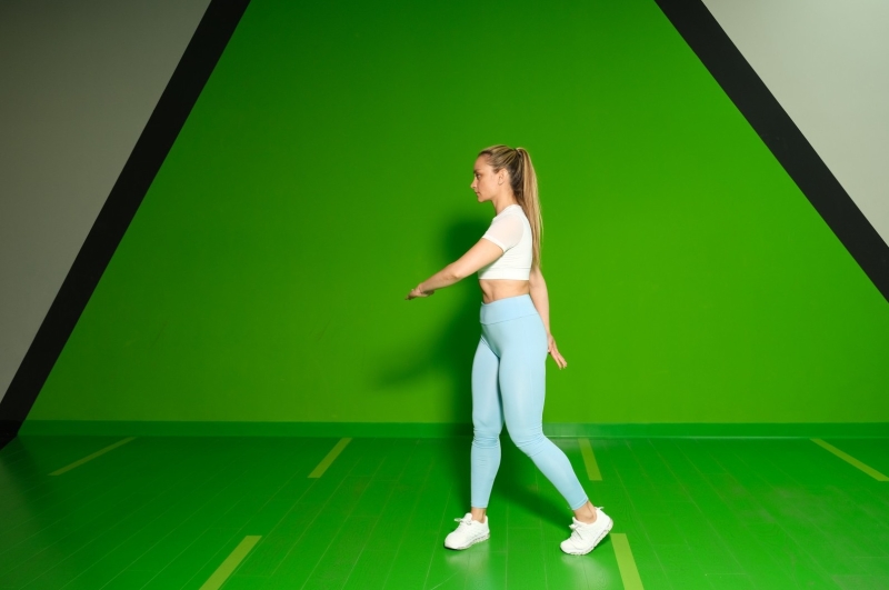 Исходное положение стоя, с вдохом сделайте шаг вперед правой ногой и вытянитесь за руками вверх, с выдохом вернитесь в исходное положение и повторите другой ногой. 20 повторений.