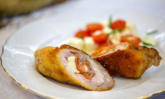 Мясные рулетики в панировке с моцареллой и помидорами -..