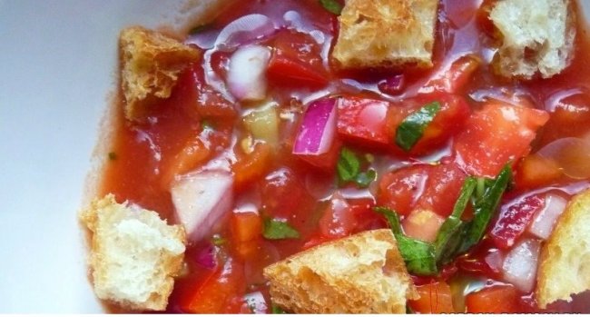 Ингредиенты: 1/2 огурца ---------------------- 6 спелых помидоров-сливок (мелко порезать) ---------------------- 1 маленькая красная луковица (очистить, мелко порубить) ---------------------- 1 зубчик чеснока (очистить, раздавить) ---------------------- 1 красный болгарский перец (очистить от семян, мелко порубить) ---------------------- сок 1/2 лимона ---------------------- морская соль, свежемолотый черный перец ---------------------- 300 мл холодного куриного бульона или овощного бульона ---------------------- 300 мл томатного сока ---------------------- капля соуса табаско ---------------------- капля вустерского соуса ---------------------- горсть зелени базилика (порубить) ---------------------- несколько веточек эстрагона (только листики; порубить) Для подачи: зеленые оливки без косточек (порубить) ---------------------- свежий огурец (нарезать кубиками) Приготовление: Разрежьте огурец вдоль, выберите семена чайной ложкой, очистите от шкурки. Мякоть порежьте в глубокую миску. Добавьте помидоры, лук, чеснок, красный перец и лимонный сок. Посолите, поперчите, перемешайте. Залейте холодным бульоном и томатным соком, добавьте табаско, вустерский соус, базилик и эстрагон. Затяните миску пищевой пленкой и поставьте суп в холодильник как минимум на 2 часа, чтобы ароматы раскрылись. Перед подачей попробуйте, при необходимости досолите и поперчите, разлейте по охлажденным тарелкам. Отдельно подайте мисочки с оливками и огурцом, чтобы каждый мог приправить свою порцию по вкусу. Приятного Вам аппетита!