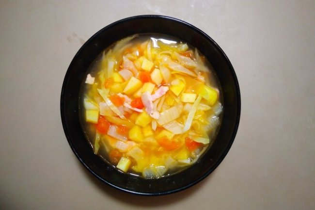 Ингредиенты: бульон куриный 1.5 л ---------------------- помидоры 700 г ---------------------- капуста белокочанная 250 г ---------------------- картофель 250 г ---------------------- бекон 100 г ---------------------- лук репчатый 70 г ---------------------- перец черный молотый по вкусу ---------------------- соль по вкусу Приготовление: ШАГ 1 Лук нарезать на кубики, бекон соломкой. Кладем в кастрюлю и жарим 10 минут на среднем огне, перемешивая. ШАГ 2 Картофель и помидоры очистить от кожуры и нарезать кубиками. Добавить в кастрюлю и залить куриным бульоном. Довести до кипения, затем варим 10 минут. ШАГ 3 Капусту нашинковать, добавить в кастрюлю, посолить и поперчить. Довести до кипения и варим 10 минут. Приятного Вам аппетита!