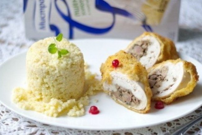 Ингредиенты: куриная грудка 1 шт. ---------------------- куриная печень 100 г ---------------------- пшено 2 пакетика ---------------------- лук репчатый 1 шт. ---------------------- яйца 1 шт. ---------------------- мука пшеничная ---------------------- сухари панировочные ---------------------- масло растительное ---------------------- перец черный молотый ---------------------- соль Приготовление: Шаг 1. Приготовить пшено: не открывая, опустить пакетик в подсоленную, кипящую воду. Варить 25 минут на тихом огне. Шаг 2. Приготовить куриную грудинку. Разделить грудку на маленькое и большое филе. Шаг 3. В маленьком филе убрать центральную прожилку. Шаг 4. Большое филе разрезать вдоль. Шаг 5. Из одной грудки получится приблизительно 6 одинаковых филе. Шаг 6. Отбить мясо молотком, посыпать перцем, солью. Шаг 7. Порезать на маленькие кусочки куриную печень или пропустить через мясорубку. Шаг 8. Почистить лук, измельчить, обжарить. Шаг 9. Положить печень, обжаривать несколько минут. Шаг 10. На филе положить по 2 большие ложки начинки, завернуть в рулетики, закрывать краешки. Шаг 11. Взболтать яйцо. Шаг 12. Обвалять рулеты в муке, затем в яйце, в конце в сухариках. Шаг 13. Обжарить трубочки на растительном масле до появления корочки с разных сторон. Шаг 14. Порезать рулеты на кусочки. Подавать с пшеном. Шаг 15. Получается очень вкусная грудка фаршированная куриной печенью. Приятного Вам аппетита!