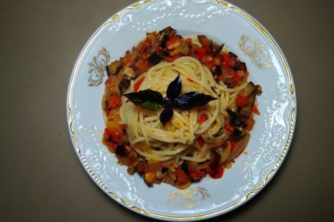 Ингредиенты: спагетти 300 г ---------------------- баклажаны 2 шт. ---------------------- помидоры 400 г ---------------------- лук репчатый 200 г ---------------------- перец чили 20 г ---------------------- базилик 14 г ---------------------- чеснок 1 зубчик ---------------------- соль ? ч.л. ---------------------- масло растительное (для жарки) 2 ст.л. Приготовление: Шаг 1. Баклажаны нарезать квадратиками, посолить и оставить на 30 минут. Затем обжарить их на растительном масле 20 минут, перемешивая. Шаг 2. Лук разрезать на 4 части и нарезать полукольцами. На отдельной сковороде обжарить на растительном масле 10 минут, перемешивая с перцем чили (Чили не нарезать!). Шаг 3. Помидоры нарезать квадратиками и добавить к луку, добавить сахар и соль. Обжарить 10 минут на среднем огне, перемешивая. Шаг 4. Половину базилика мелко порубить, чеснок мелко нарезать и добавить их к помидорам с луком. Вынимаем перец чили и обжариваем 5 минут. Шаг 5. Эту смесь добавляем к баклажанам нарезать оставшийся базилик, добавить отваренные спагетти. Приятного Вам аппетита!