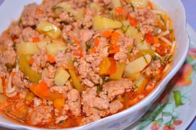 Ингредиенты: спагетти 400 г ---------------------- фарш 300 г ---------------------- картофель 2 шт. ---------------------- лук репчатый 1 шт. ---------------------- помидоры 1 шт. ---------------------- морковь ? шт. ---------------------- перец сладкий болгарский ? шт. ---------------------- чеснок 5 зубчиков ---------------------- томатная паста 2 ст.л. ---------------------- сахар ? ч.л. ---------------------- специи для мяса по вкусу ---------------------- вода (бульон) ---------------------- соль Приготовление: Шаг 1. Порезать лук, порезать до чуть-чуть золотистого оттенка. Шаг 2. Положить фарш, обжаривать, пока не испарится жидкость, непрерывно помешивать. Шаг 3. Положить измельченную морковь, насыпать сахар, соль, специи, размешать. Чуть-чуть потушить. Шаг 4. Положить помидоры, порезанные кубиками, томатную пасту, размешать. Тушить минуты две. Шаг 5. Положить мелко порезанный картофель, налить воду, чтобы покрывала мясо и овощи более, чем на 0,5 сантиметров, размешать. Шаг 6. Спустя минут десять положить прессованный чеснок, перец, порезанный соломкой. Тушить. Шаг 7. Посыпать зеленью. Шаг 8. В соленой воде отварить спагетти. Шаг 9. Переложить спагетти на тарелку, залить ленивый лагман со спагетти мясным соусом. Приятного Вам аппетита!