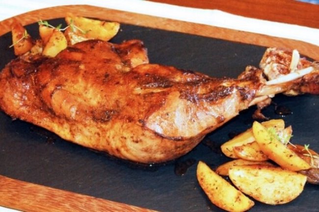 Ингредиенты: масло сливочное 100 г ---------------------- картофель 6 шт. ---------------------- голень индейки 2 шт. ---------------------- помидоры 1-2 шт. ---------------------- масло оливковое/растительное 2 ст.л. ---------------------- чеснок 2 зубчика ---------------------- прованские травы ---------------------- смесь перцев ---------------------- соль Приготовление: 1. Осторожно снять с голени кожу, используя нож. Прорезать пленку с голени, пока не дойдет до кости. Протыкать ножки, чтобы впиталось предварительно приготовленное ароматное масло. Приготовить его следующим образом: положить в сливочное масло соль, перцы, прессованный чеснок, добавить оливковое или растительное масло. Шаг 2. Натереть мясо маслом, снова одеть «чулок», намазать остальным маслом. Порезать картофель на крупные куски, выложить его на противень, посыпать солью, сверху положить помидоры, порезанные на кусочки. На овощи выложить голени. Выпекать 50 минут, соблюдать температуру 200 градусов. Можно подавать запеченные голени индейки с травами. Приятного Вам аппетита!