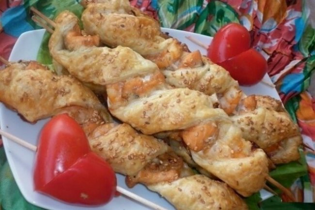 Ингредиенты: рыба (семга) 300 г ---------------------- тесто слоеное 250 г ---------------------- креветки 10-12 шт. ---------------------- сыр 50-70 г ---------------------- яйца 1 шт. ---------------------- специи по вкусу ---------------------- лимонный сок ---------------------- соус соевый ---------------------- кунжут ---------------------- соль Приготовление: ШАГ 1 Порезать рыбку на небольшие кусочки, посыпать специями, солью. ШАГ 2 Мариновать в смеси соевого соуса и сока лимона. ШАГ 3 Почистить креветки. ШАГ 4 Порезать сыр на маленькие кубики. ШАГ 5 Собрать на шпажки рыбу, куски сыра, креветки. ШАГ 6 Порезать тесто на полосочки по несколько сантиметров в ширину. ШАГ 7 Обкрутить шашлыки по спирали, уложить на противень. ШАГ 8 Намазать яйцом, посыпать кунжутом. ШАГ 9 Готовить шашлычки из рыбы и креветок в тесте минут тридцать, соблюдать температуру 180 градусов. СОВЕТ Подавать с овощами или легким салатиком. Приятного Вам аппетита!