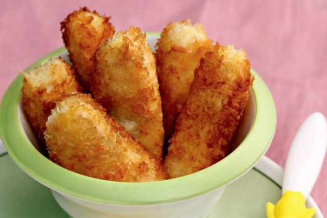 Ингредиенты: филе трески 600 г ---------------------- яйца 3-4 шт. ---------------------- сухари панировочные 200 г ---------------------- мука 130 г ---------------------- масло оливковое Приготовление: ШАГ 1 Филе трески нарезать полосками толщиной в два или три сантиметра. ШАГ 2 Кусочки рыбы обвалять сначала в муке с солью и молотым перцем, затем – во взбитых подсоленных яйцах, в заключение – в панировочных сухарях. ШАГ 3 Противень застелить фольгой, выложить кусочки филе на расстоянии друг от друга. ШАГ 4 Прикрыть вторым листом фольги, подержать в холоде полчаса. ШАГ 5 Жарить на оливковом масле с двух сторон до корочки. ШАГ 6 Рыбные палочки выложить на полотенце из бумаги, оставить для впитывания излишков жира. Другой вариант – блюдо можно запечь в духовке. СОВЕТ К блюду можно приготовить салат из свежих помидоров, огурцов. Приятного Вам аппетита!