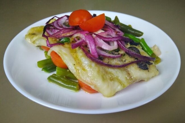 Ингредиенты: масло оливковое 3 ст.л. ---------------------- вино белое сухое 2 ст.л. ---------------------- чеснок 2 зубчика ---------------------- маслины 7 шт. ---------------------- петрушка 1 ст.л. ---------------------- соль ? ч.л. ---------------------- горчица дижонская ? ч.л. ---------------------- смесь перцев ? ч.л. ---------------------- фасоль стручковая 100 г ---------------------- помидоры черри 150 г ---------------------- филе белой рыбы 350 г ---------------------- лук красный 70 г Приготовление: ШАГ 1 В пиале смешать оливковое масло, вино, чеснок пропущенный через пресс, мелко нарезанные маслины и петрушка, соль, перец, дижонская горчица – перемешать. ШАГ 2 Противень застелить фольгой. На дно выложит стручковую фасоль. Сверху помидорки черри разрезанные пополам, сверху белую рыбу. ШАГ 3 Рыбу смазать соусом из первого шага. ШАГ 4 Красный лук нарезать тонкими полукольцами. Выложить последним слоем. Запечатать рыбу фольгой. ШАГ 5 Ставим в духовку при температуре 200 градусов на 30 минут. Приятного Вам аппетита!