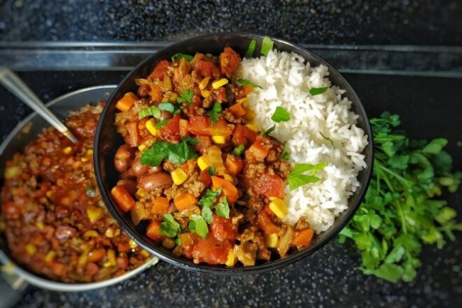 Ингредиенты: корень фенхеля 1 шт. ---------------------- лук репчатый 1 шт. ---------------------- морковь 1 шт. ---------------------- перец чили 1 шт. ---------------------- чеснок 2 зубчика ---------------------- зира 2 ст.л. ---------------------- паприка 1 ст.л. ---------------------- перец красный молотый 1.5 ч.л. ---------------------- корица ? ч.л. ---------------------- сахар 3 ст.л. ---------------------- говяжий фарш 400 г ---------------------- фасоль консервированная 400 г ---------------------- помидоры в собственном соку 680 г ---------------------- кукуруза консервированная 4 ст.л. Приготовление: ШАГ 1 Лук и фенхель нарезать небольшими кубиками. В сковороде разогреть оливковое масло, обжариваем лук и фенхель в течении 10 минут на среднем огне, перемешивая. ШАГ 2 Морковь нарезать небольшими кубиками. Перец чили нарезать тонкими колечками. Отправляем в сковороду к луку и фенхелю, обжариваем еще 10 минут, перемешивая. ШАГ 3 Спустя 10 минут добавляем говяжий фарш и тщательно перемешиваем, чтобы фарш не превратился в котлету. Готовим на среднем огне пока не выпариться вся жидкость периодически перемешивая. ШАГ 4 Добавить в сковороду паприку, зиру, чеснок пропущенный через пресс, красный жгучий перец и корицу, перемешиваем. Готовим 2 минуты. ШАГ 5 Спустя 2 минуты добавляем кукурузу и фасоль, вливаем соус из томатов и нарезаем сами томаты на маленькие кубики, посыпаем сахаром. Перемешиваем и накрываем крышкой. Готовим 10 минут на медленном огне. Приятного Вам аппетита!
