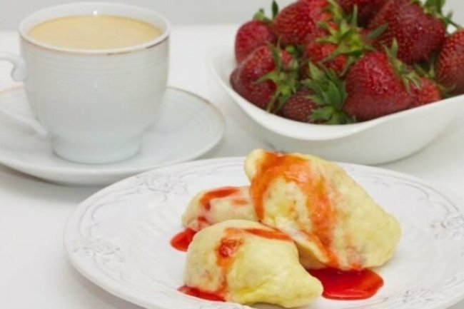 Ингредиенты: мука 490 г ---------------------- творог 140 г ---------------------- сахар ? стакана ---------------------- яйца 3 шт. ---------------------- сметана 40 г ---------------------- сода ? ч.л. ---------------------- соль для начинки: клубника 220 г ---------------------- сахарная пудра 60 г Приготовление: ШАГ 1 Взбить яйца с сахарным песком. ШАГ 2 Всыпать соду, соль, положить творог. ШАГ 3 Ингредиенты перемешать, оставить на пять или семь минут. ШАГ 4 Всыпать муку, вымесить тесто, скатать в колбаску, нарезать ломтиками. ШАГ 5 Заготовки раскатать, выложить хорошо промытую клубнику, посыпать сахарной пудрой. ШАГ 6 Готовые вареники смазать растительным маслом, поставить на огонь. ШАГ 7 Отварить в течение нескольких минут. СОВЕТ Готовое блюдо можно полить растопленным сливочным маслом, украсить ягодами. Приятного Вам аппетита!