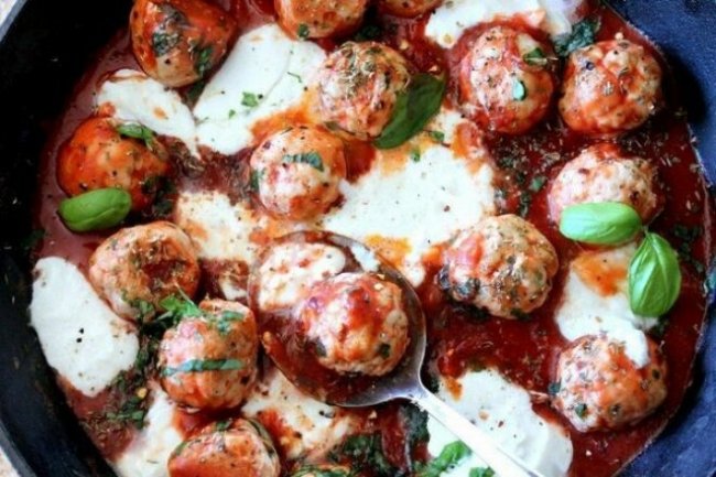 Готовые фрикадельки переложить в соус, полить каждый шарик полученной смесью, сверху положить целые листья базилика. Сыр выложить в любом порядке. Прогревать фрикадельки из индейки в течение пяти минут на среднем огне, до расплавления сыра.