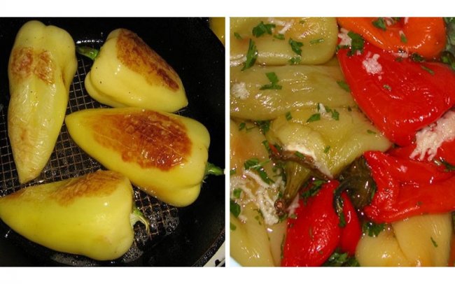 Болгарский перец вымойте, не очищая от семян и плодоножек, обжарьте с двух сторон на подсолнечном масле. Готовые перцы сложите в глубокую емкость.