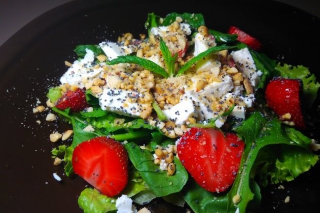 Зеленый салат с клубникой, арахисом и сыром фета - «Закуски»