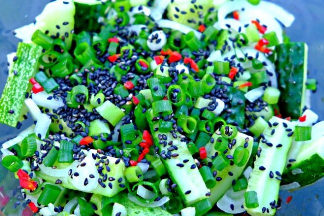 Ингредиенты: огурцы 400 г ---------------------- лук репчатый (маленькая луковица)1 шт. ---------------------- лук зеленый 1 шт. ---------------------- масло растительное 2 ст.л. ---------------------- соус соевый 2 ст.л. ---------------------- кунжут (обжаренный) 2 ч.л. ---------------------- чеснок 2 зубчика ---------------------- сахар ? ч.л. ---------------------- перец чили (маленький кусочек длиной 3 см)по вкусу ---------------------- соль по вкусу Приготовление: Шаг 1. Перец чили очень мелко измельчить, добавить сахар и растереть в пасту. Шаг 2. Чеснок мелко измельчить. Шаг 3. Смешать перец чили, чеснок, соевый соус и растительное масло. Шаг 4. Нарезать мелко зеленый и репчатый лук. Огурцы нарезать на продольные ломтики. Шаг 5. Перемешать все ингредиенты, посыпать сверху кунжутом, посолить или добавить соевый соус при необходимости. Дать настояться 5 минут, и можно подавать к столу. Приятного Вам аппетита!