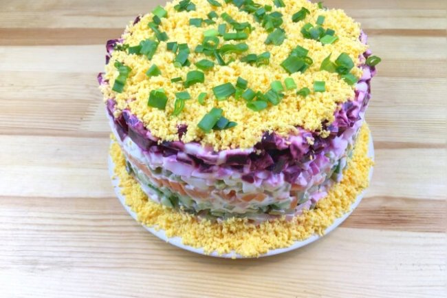 Ингредиенты: картофель в мундире 200 г ---------------------- колбаса вареная 200 г ---------------------- огурцы маринованные 100 г ---------------------- огурцы свежие 100 г ---------------------- зеленый горошек консервированный 100 г ---------------------- лук репчатый 1 шт. ---------------------- яйца вареные 5 шт. ---------------------- морковь вареная 200 г ---------------------- свекла вареная 200 г ---------------------- сметана 3 ст.л. ---------------------- майонез 3 ст.л. ---------------------- сахар 1 ст.л. ---------------------- уксус 6% 1 ст.л. ---------------------- соль по вкусу Приготовление: Шаг 1. Для приготовления салата картофель (воду при варке подсаливала), свеклу (в воду при варке добавляла немного сахара, так она вкуснее) и морковь сварила в кожуре. Яйца сварила вкрутую. Когда овощи и яйца остыли, почистила. Шаг 2. Лук порезала полукольцами, добавила к ним соль, сахар и 6% уксус (у меня был яблочный). Все хорошо перемешала и оставила мариноваться. Заранее я его не мариновала, пока подготавливала все необходимое для салата и приступила к его сборке, лук был готов. Шаг 3. Смешала сметану и майонез в однородную массу. Получился майонезный соус. Майонез у меня был домашний, делается меньше минуты, а вкус значительно лучше магазинного. Шаг 4. Картофель я нарезала мелким кубиком, можно натереть на крупной терке (так получится быстрее). Выложила первым картофельный слой и смазала майонезным соусом. Шаг 5. На картофель выложила вареную колбасу, нарезанную мелкими кубиками. И смазала майонезным соусом. Шаг 6. На колбасу положила тонким слоем маринованный лук, соусом не смазывала. Шаг 7. На лук положила свежие и маринованные огурцы нарезанные мелким кубиком. Смазала соусом. Шаг 8. Затем вареная морковь, также мелко нарезанная и соус сверху. Шаг 9. Консервированный горошек и слой майонеза. Шаг 10. Белки и соус. Шаг 11. Свекла и соус. Шаг 12. Последний слой тертые на мелкой терке желтки. Засыпала ими салат и украсила мелко нарезанным зеленым луком. После приготовления салат желательно поставить в холодильник, чтобы немного застыл, и его можно было легко разрезать. Приятного Вам аппетита!