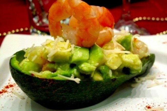 Ингредиенты: креветки тигровые 12 шт. ---------------------- авокадо 1 шт. ---------------------- лайм 1 шт. ---------------------- огурцы 50 г ---------------------- сыр пармезан 15 г ---------------------- имбирь 4 г ---------------------- масло оливковое 2 ст.л. ---------------------- чеснок 1 зубчик ---------------------- перец черный молотый ---------------------- соль Приготовление: Шаг 1. Разрезать авокадо, удалить косточку, удалить, не повредив кожуры, всю мякоть, нарезать ее на небольшие кубики. Вымытые огурцы измельчить на такие же кубики, креветки (8 шт) разрезать на несколько кусочков, объединить всю нарезку. Шаг 2. Хорошо перемешать между собой ингредиенты для заправки, окунуть в соус отложенные креветки, положить их в сторону, заправить салат из авокадо с креветками, аккуратно размешать. Шаг 3. Заполнить половинки кожуры салатом, оформить оставшимися креветками в соусе, присыпать верх стружкой пармезана. Приятного Вам аппетита!