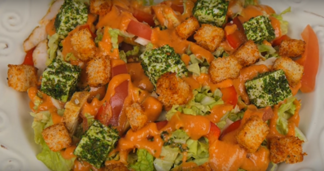 Ингредиенты: куриное филе 100 г ---------------------- капуста пекинская 100 г ---------------------- помидоры 100 г ---------------------- перец сладкий болгарский 100 г ---------------------- сыр фета 100 г ---------------------- сухарики 100 г ---------------------- яйца 3 шт. ---------------------- кетчуп 30 г ---------------------- масло растительное 1 ст.л. ---------------------- горчица 1 ч.л. ---------------------- соль Приготовление: Шаг 1. Куриное филе отварить и нарезать полосками, сыр «Фета» - кубиками, нашинковать пекинскую капусту. Шаг 2. Измельчить помидоры и болгарский перец. Шаг 3. Приготовить заправку из горчицы, отваренных куриных желтков, растительного масла и кетчупа. Шаг 4. Продукты соединить, добавить сухарики, заправить соусом. СОВЕТ Салат можно украсить любой зеленью. Приятного Вам аппетита!